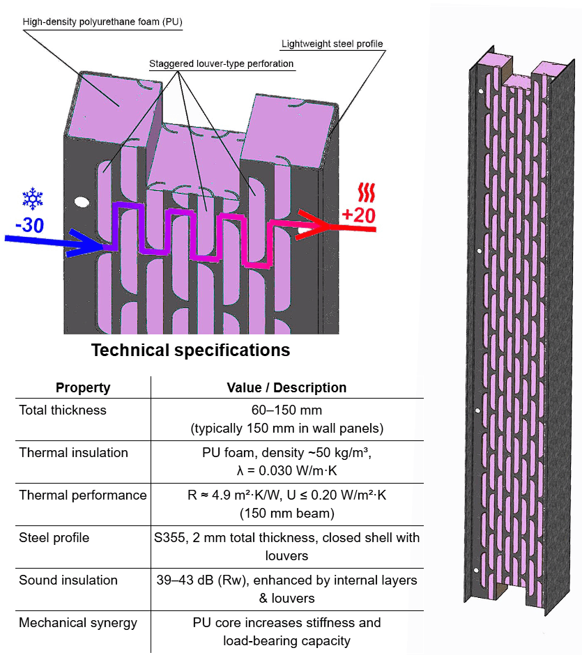 ThermoBEAM is a patented structural beam designed for use in modular construction, where rigidity, thermal insulation, and quick assembly are particularly important. The beam is a closed steel profile with thermal perforations arranged in a checkerboard pattern (in the form of “blinds”), the internal cavity of which is filled with rigid high-density polyurethane foam (PUR) after assembly.