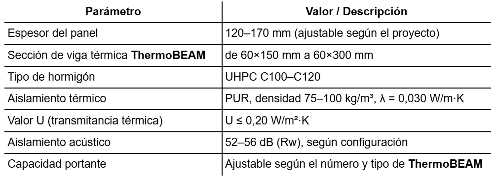 Solución modular de fachada, diseñada para su uso en estructuras portantes y de cerramiento, donde tanto la resistencia como la eficiencia energética son críticas. El panel está compuesto por dos capas de hormigón de alta resistencia (UHPC) y un armazón termo-reforzado integrado ThermoBEAM, que cumple simultáneamente las funciones de nervio estructural de rigidez y barrera de aislamiento térmico.