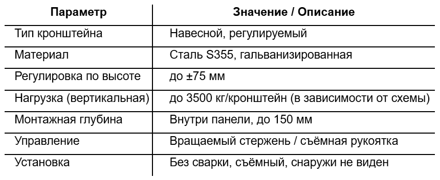 • Обеспечивает регулируемую опору и фиксацию панели или прерамы в проектном положении;