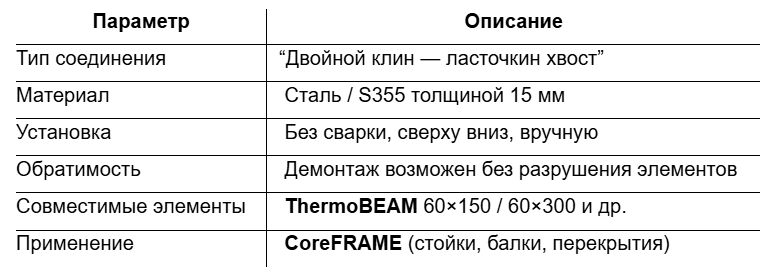 Ключевой монтажный элемент системы KARKASYS. Обеспечивает быстрое и надёжное соединение термопрофилей ThermoBEAM в каркасе без использования сварки, болтов или мокрых процессов.