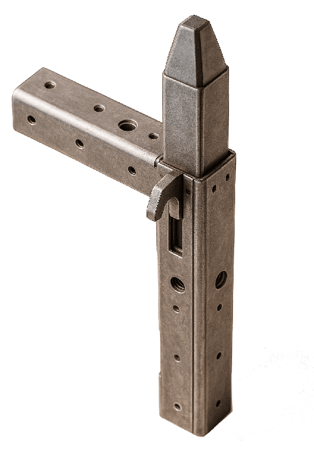 • Нижний элемент (принимающая часть) — фиксируется внутри стойки или балки нижнего уровня.