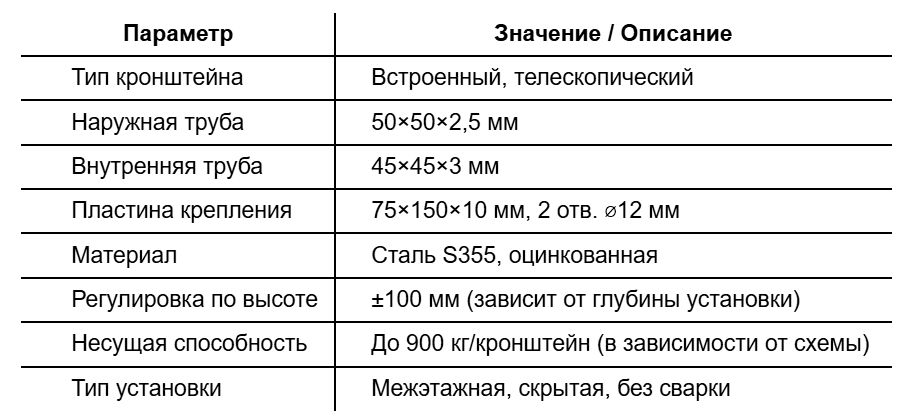 • Обеспечивает надёжное и регулируемое крепление к опорной пластине, зафиксированной на железобетонной плите перекрытия;