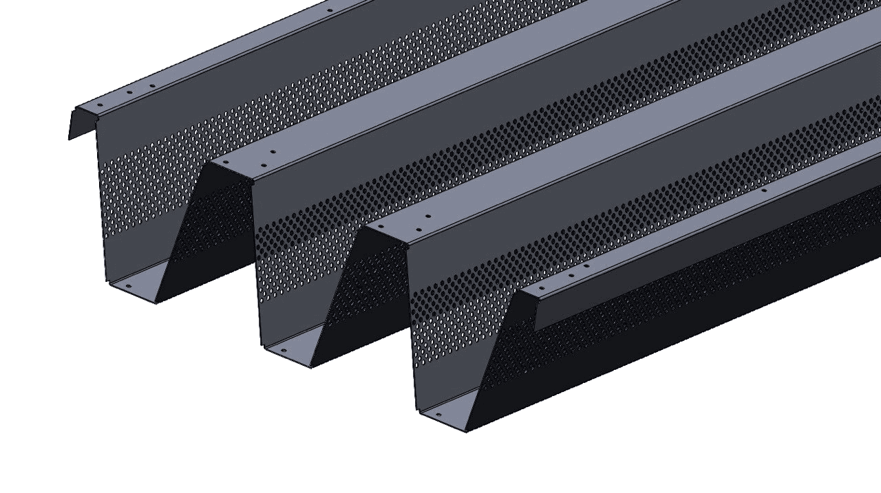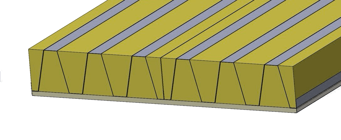 • Несущая часть выполнена из трапециевидных металлических профилей, изготовленных из стали S355 с перфорацией для улучшения тепло-звукоизоляционных характеристик .