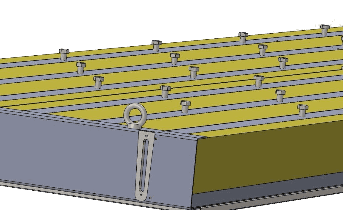 • Профили на торцах, жёстко соединены с боковыми швеллерами, на которых установлены ответные части VU-коннекторов. Гайки, приваренные к внутренней поверхности верхней полки трапециевидного профиля, с шагом установки — 300×300 мм, высота установки — 25–30 мм, служат для надёжного сцепления несущего элемента плиты перекрытия, с бетонной стяжкой.