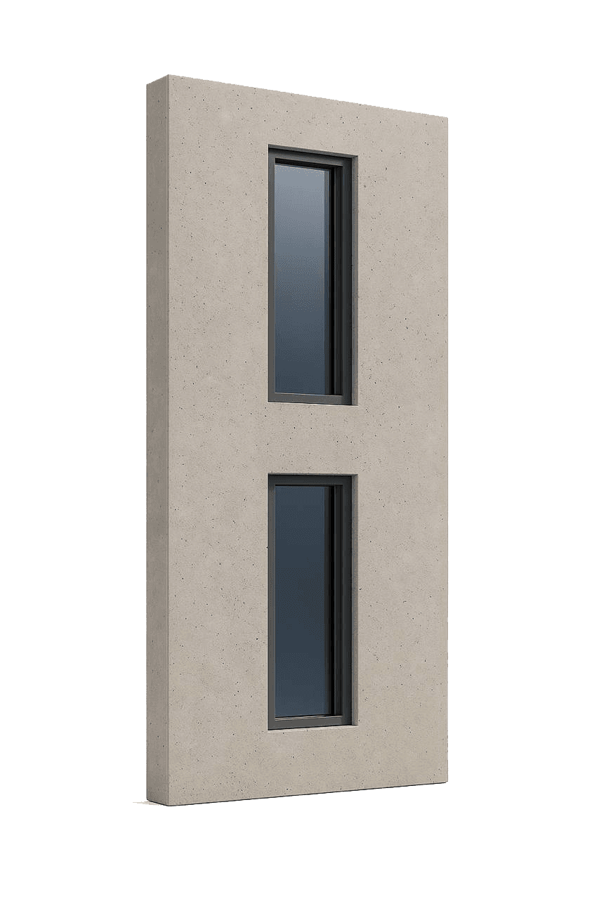 PanelCORE — это сборная двухслойная панель из UHPC с внутренним термоармированным каркасом (технология ThermoBEAM). Панель сочетает в себе несущую прочность, тепло- и звукоизоляцию, а также точную модульную геометрию, позволяя сократить объём бетона без потери несущей способности. PanelCORE поставляется с завода готовой к монтажу, с интегрированным утеплителем и оконными модулями.